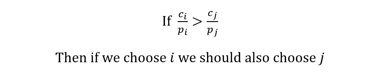 Consider 2 opportunities, i and j. They have cost c[i] and c[i] and profits p[i] and p[j] respectively.