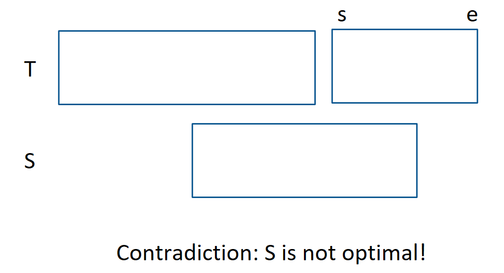 Choose any task (s,e) in T. Now look at all tasks in S that have an ending time between s and e. Since our algorithm always picks the task with the earliest end time, there must be a contradiction in all cases except for tasks that start before s which we couldn’t take due to overlap. Since all such tasks overlap (their ending times are between s and e and all start before s), we can only take at most one such task by choosing not to take the previous task. However, since this requires replacing 2 jobs with one, it is not optimal and that is a contradiction.
