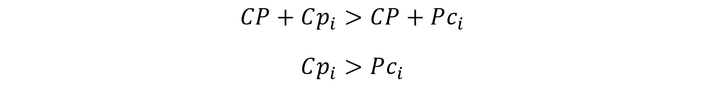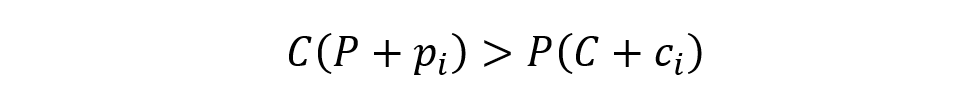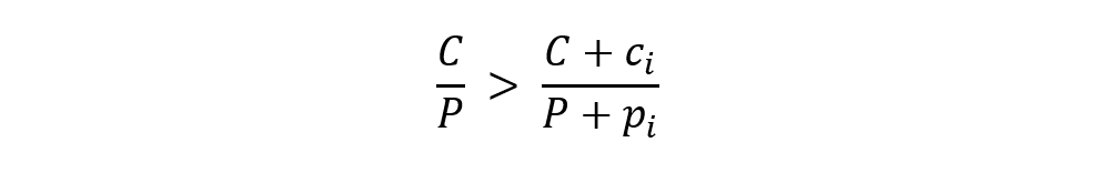Anyway, notice that it is only good to take an opportunity if it improves the number of days we can make our money back in. Otherwise, we can always just not take that opportunity. So, we can write this mathematically. Suppose that it is optimal to take some opportunity with cost c[i] and daily profit p[i]. Then,